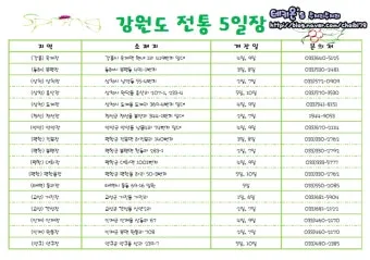 강원도 5일장은 매월 끝자리가 2일, 7일에 열리는 화천장, 3일, 8일의 삼척장, 4일, 9일의 영월덕포장과 봉평장, 5일, 10일의 정선장 등 지역별로 다양한 날짜에 개장되며, 각 장터마다 독특한 먹거리와 강정이 유명합니다.